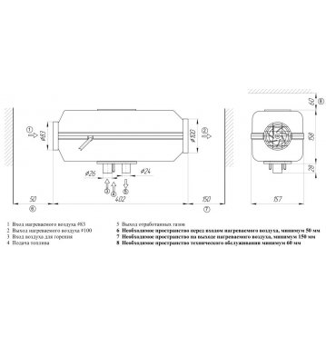 Отопитель требует подключения к сети постоянного тока 12В. Забор топлива производится по топливопроводу, который может заводиться в штатный бак с помощью топливозаборника, или же в отдельный бак.